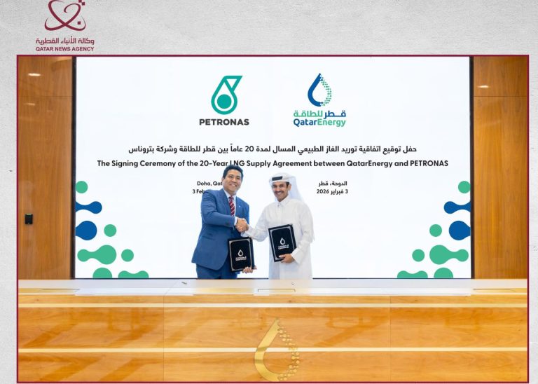 Doha, el 04 de febrero (QNA) – QatarEnergy firmó un acuerdo de compraventa de 20 años para suministrar dos millones de toneladas anuales de gas natural licuado (GNL) desde Qatar a Malasia a partir de 2028. El acuerdo fue firmado por Su Excelencia el Ingeniero Saad bin Sherida Al-Kaabi, ministro de Estado para Asuntos Energéticos,…